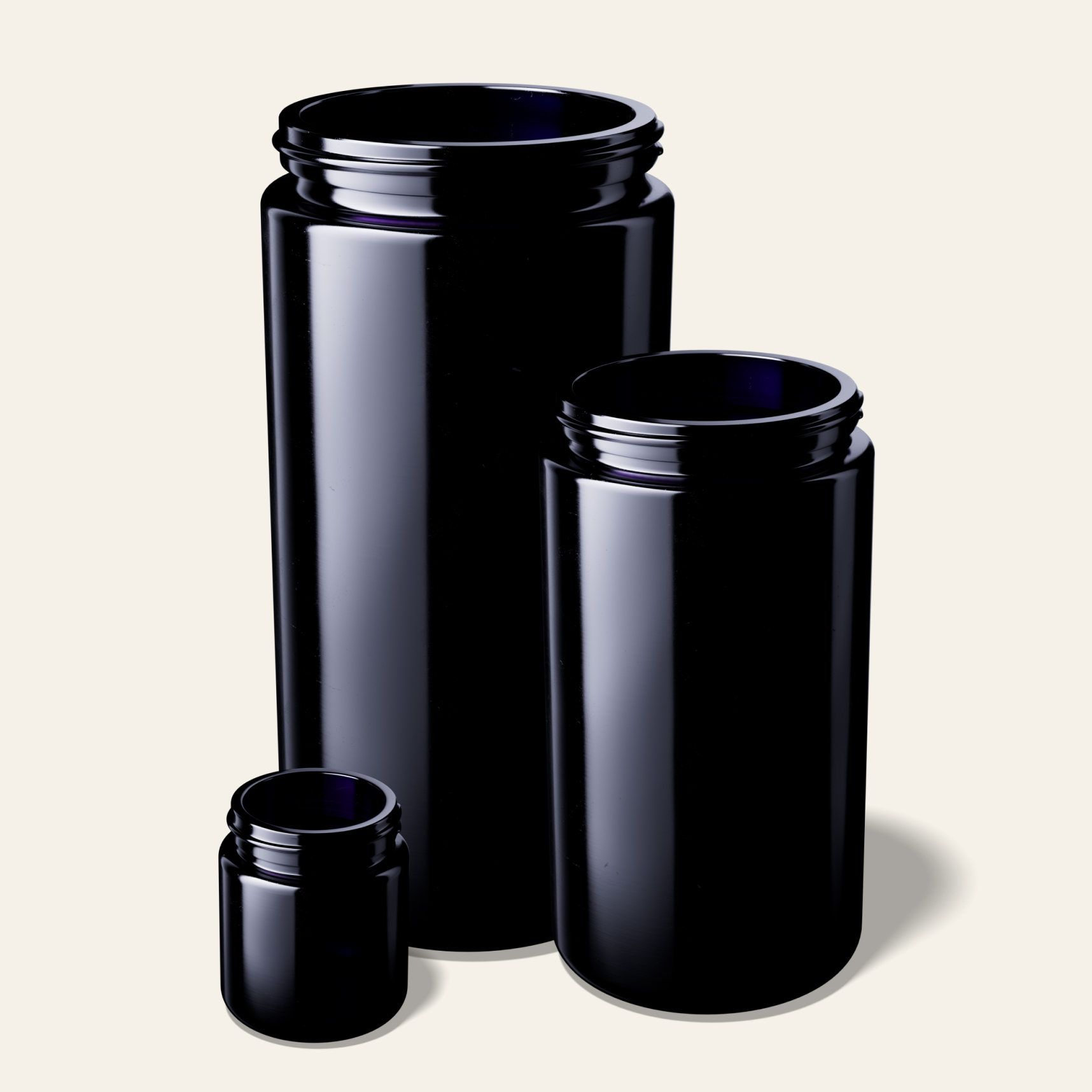 50 ml to 1 L wide neck jars for everything from small-batch pre-rolls to bulk flower storage. Airtight seal locks in aroma and freshness while showcasing your product in premium violet glass.