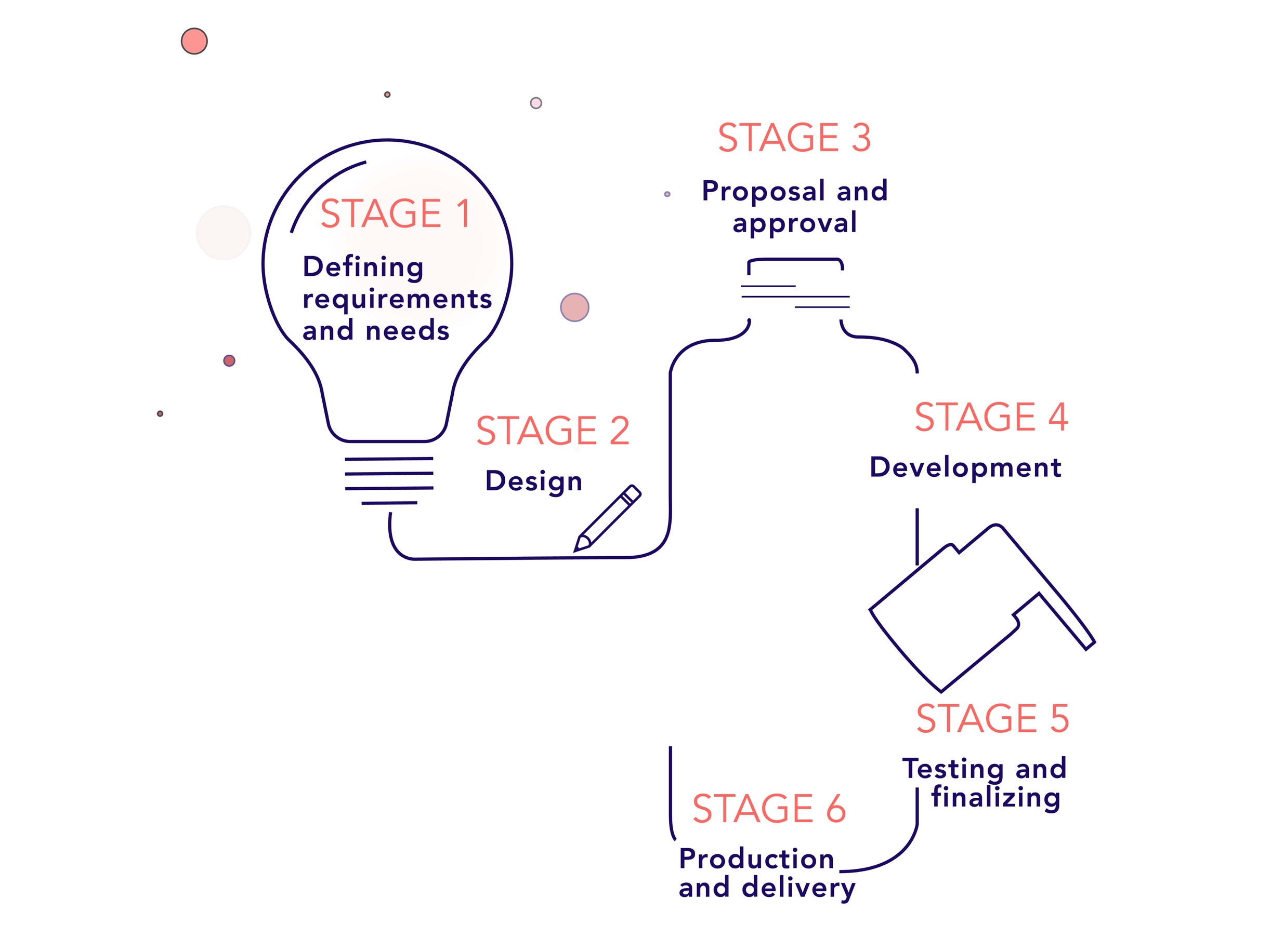 Custom projects are well... custom. So, the duration and exact steps to take will deviate project by project, but we will always go through our six proven stages of developing a new product: