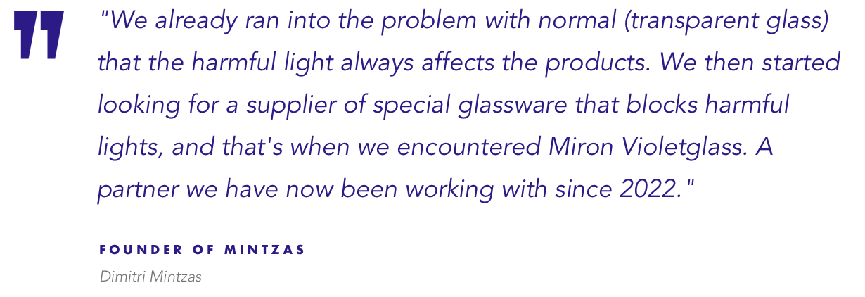 the products in the long run we encountered Miron glass. After reading some reviews and trying out the packaging, we became convinced because the quality of our products, like taste and smell, is optimally preserved over time. This allows us to guarantee the quality of our products after purchase to our consumers. Besides that, we also distinguish ourselves using Miron glass, as great attention has been paid to the appearance of our bottles and jars. As a decoration technique, we use screen printing on our olive bottle and honey jars, so no labelling."