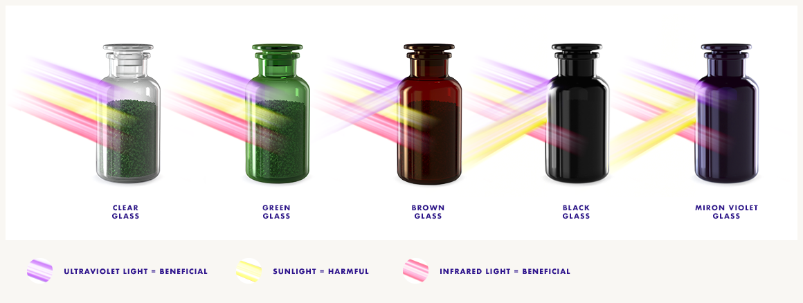 Um wirklich zu verstehen, wie dieses „Wunder“ möglich ist, müssen wir ein wenig tiefer in die Wissenschaft einsteigen. Sonnenstrahlen bestehen im Wesentlichen aus sichtbarem Licht, ultraviolettem Licht und Infrarotstrahlung. Weißes, braunes und grünes Glas lässt alle Strahlen durch, auch die, die schädlich sind für Ihr Produkt. Auf der anderen Seite lässt schwarzes oder sehr dunkles Glas keine Strahlen durch, auch nicht die, die eigentlich gut sind für Ihr Produkt.