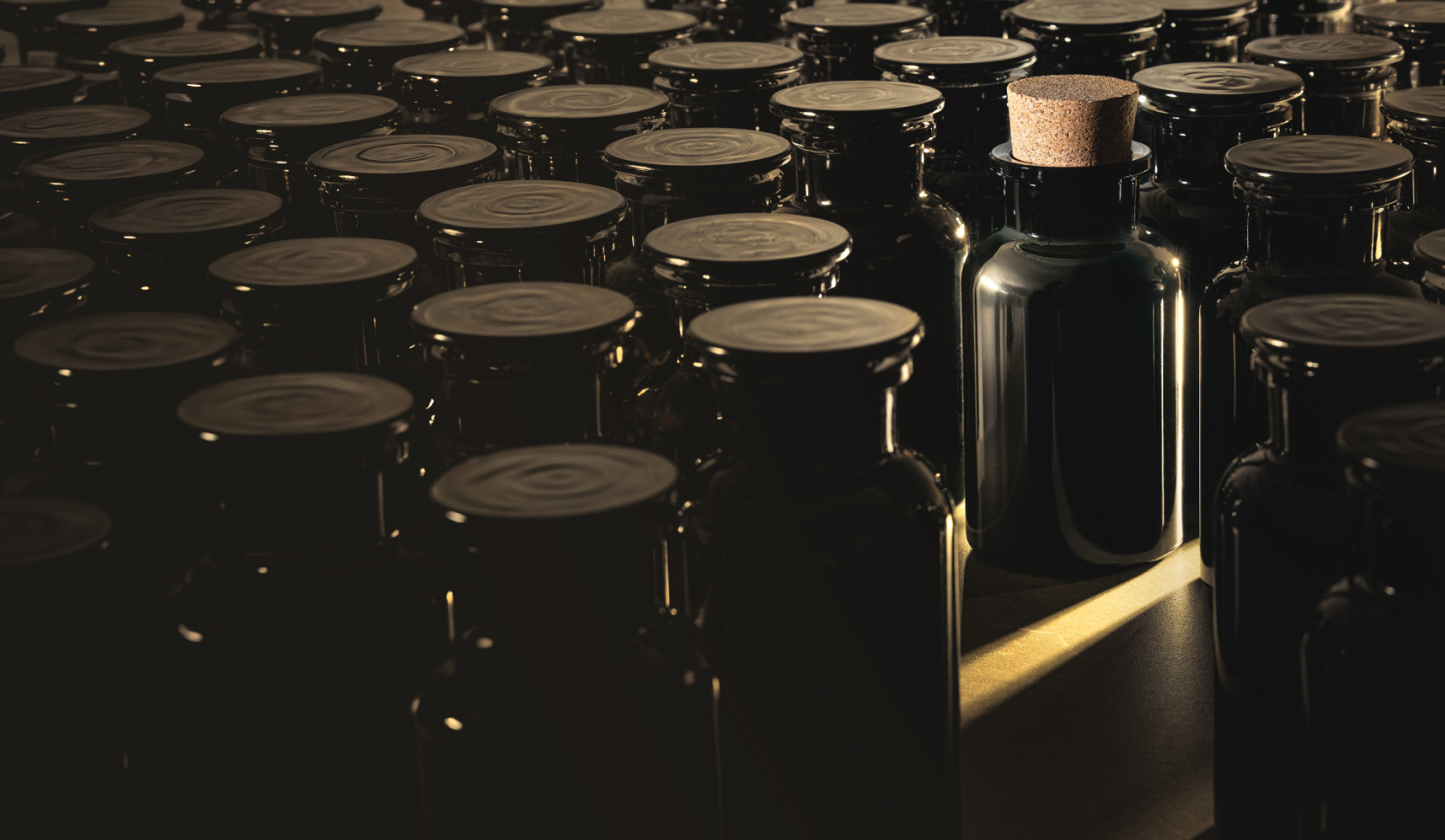 The round apothecary jar is one of the oldest functional glass forms ever made. Wide enough to fill and scoop from. Heavy enough to signal quality. Dark enough to protect what is inside from the light that breaks it down.