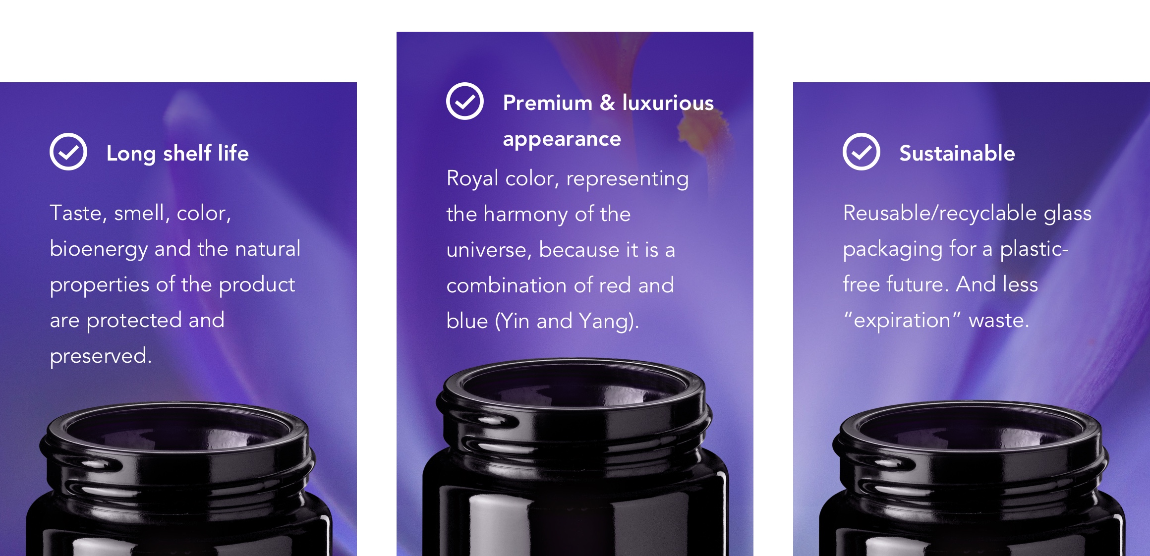 Violet glass, otherwise known as biophotonic glass, possesses unique properties. It protects natural products from the sun’s harmful rays, while allowing beneficial rays through, to enhance the contents of the jar or bottle.