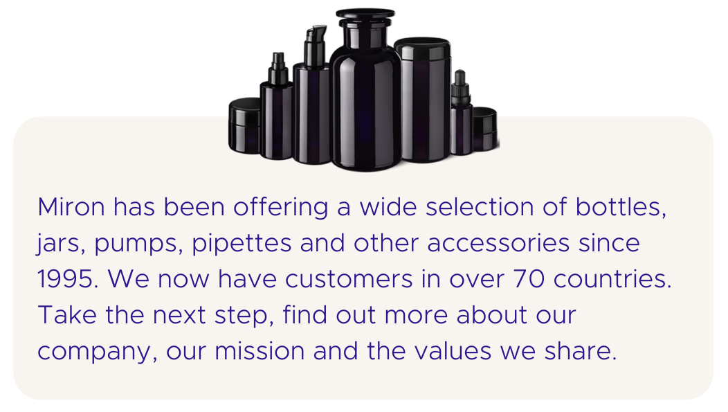 Miron Violetglass produces and distributes a unique range of glass packaging. Our trademarked “biophotonic” violet glass is specially made for natural products in the beauty, personal health and food & drinks industries.